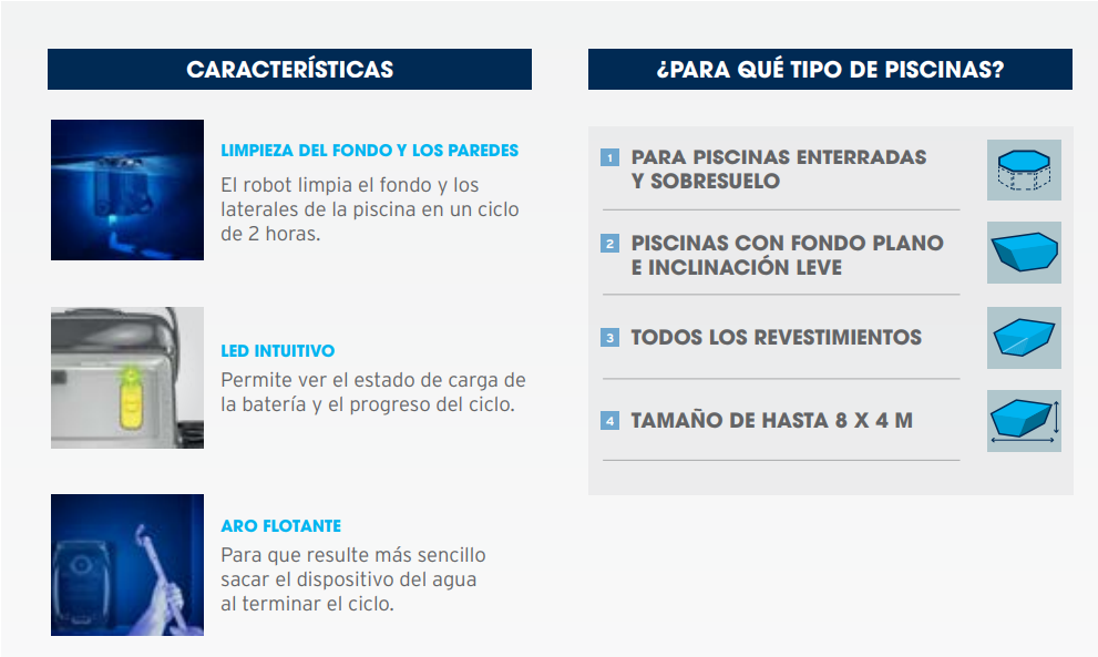 LIMPIEZA- ciclo de 2 horas. Gracias a un filtro de 150 µ y a la función de cepillado, que permite despegar los residuos rápidamente antes de ser aspirados, garantiza una limpieza óptima del fondo y de las paredes de la piscina.