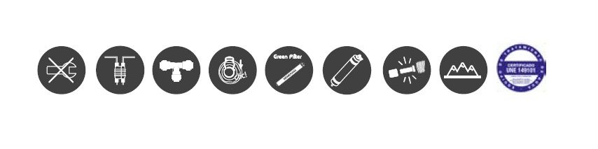 Equipo de 5 etapas (filtro triple, membrana encapsulada y postfiltro remineralizador). Kit de instalación. Grifo con válvula cerámica. Membrana Green Filter de 50 GPD encapsulada. Depósito con revestimiento plástico. Todos nuestros equipos incluyen membranas y accesorios Green Filter.