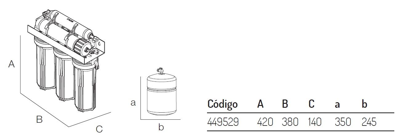 Equipo de 5 etapas (filtración 5 micras, carbón GAC, carbón BLOCK, membrana y postfiltro remineralizador). Kit de instalación. Grifo con válvula cerámica. Membrana 50 GPD.